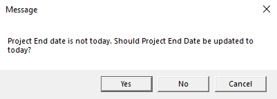 5. A confirmation message will appear (shown below), asking if you wish to update the Project End Date to today. Select Yes or No (both of these choices will end the project). Select Cancel to keep the project open.