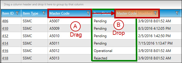 Drop the column heading before or after the midway point of another column in the tabular display. In the example above, the user has dragged the Master Code column past the midpoint of the Item Status column.