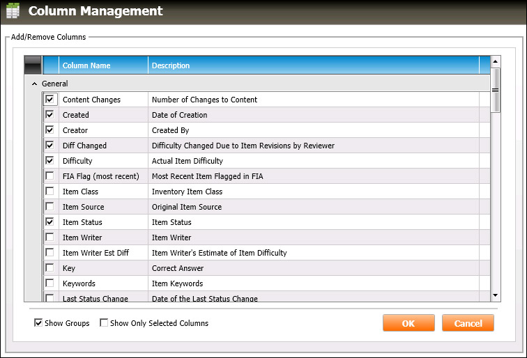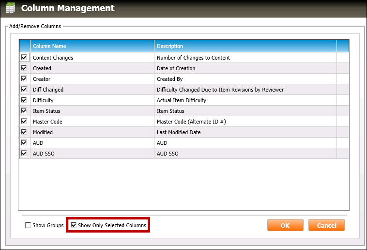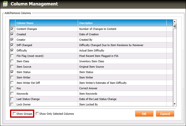 To turn off viewing the column groups within this dialog box, uncheck the Show Groups checkbox (highlighted in red, below). The Column Management dialog box will remove the groups and list the column names alphabetically: