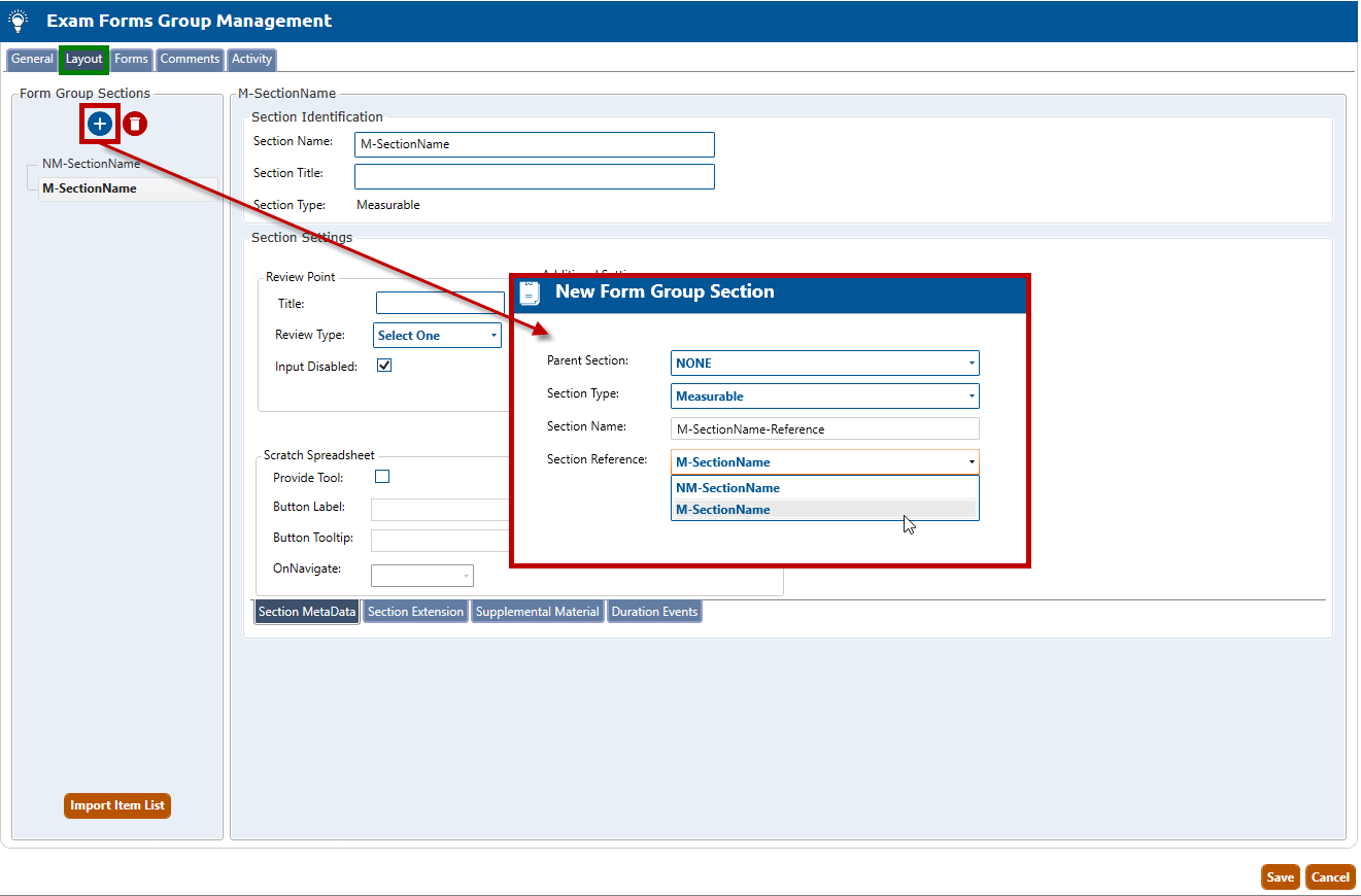 Navigate to the Layout tab (highlighted in green, below), and click the Create a New Exam Section button to open the New Form Group Section popup window (highlighted in red, below).