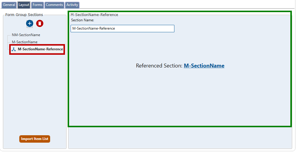 The Layout tab will populate with the new section (see figure below). The new section name (called M-SectionName-Reference in the example below) is listed on the left side of the screen (highlighted in red), while the details of the section are listed on the right side (highlighted in green).