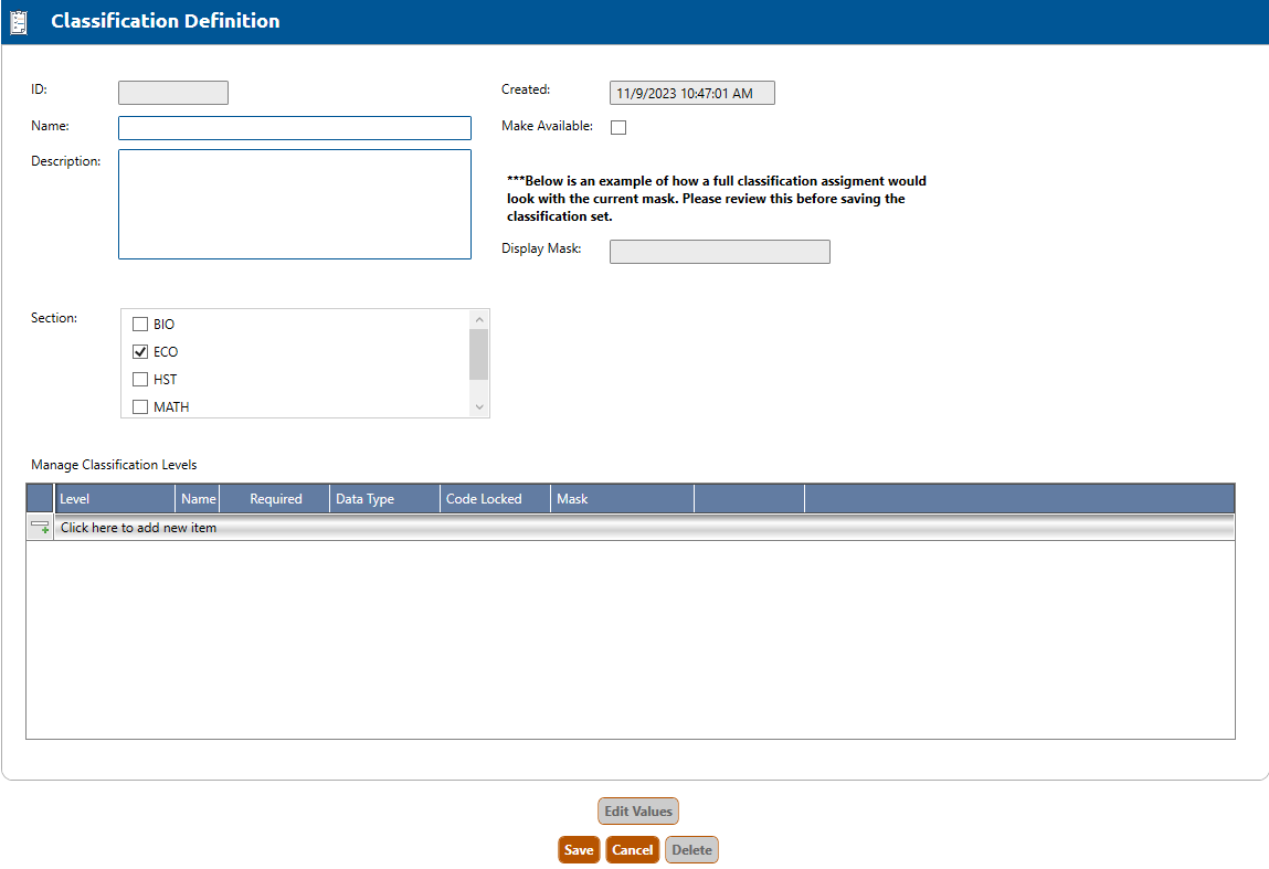 2. The Classification Definition screen will appear: