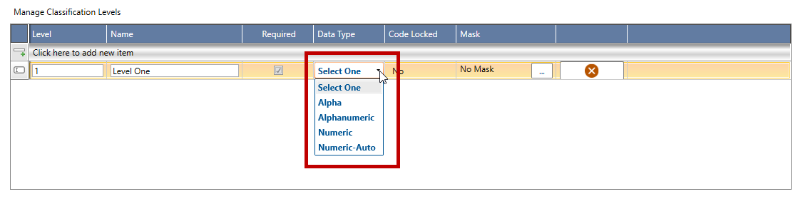 8. Select a Data Type for the level from the dropdown list (highlighted in red, below).