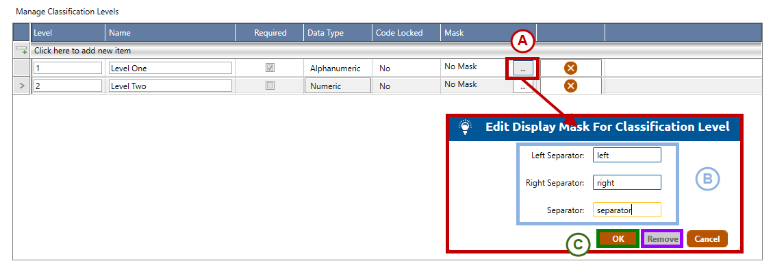 6. Select the Add icon (highlighted in red, below) in Manage Classifications Levels to add up to five classification levels for the new classification definition.