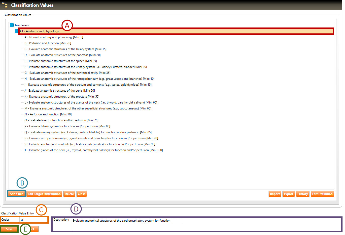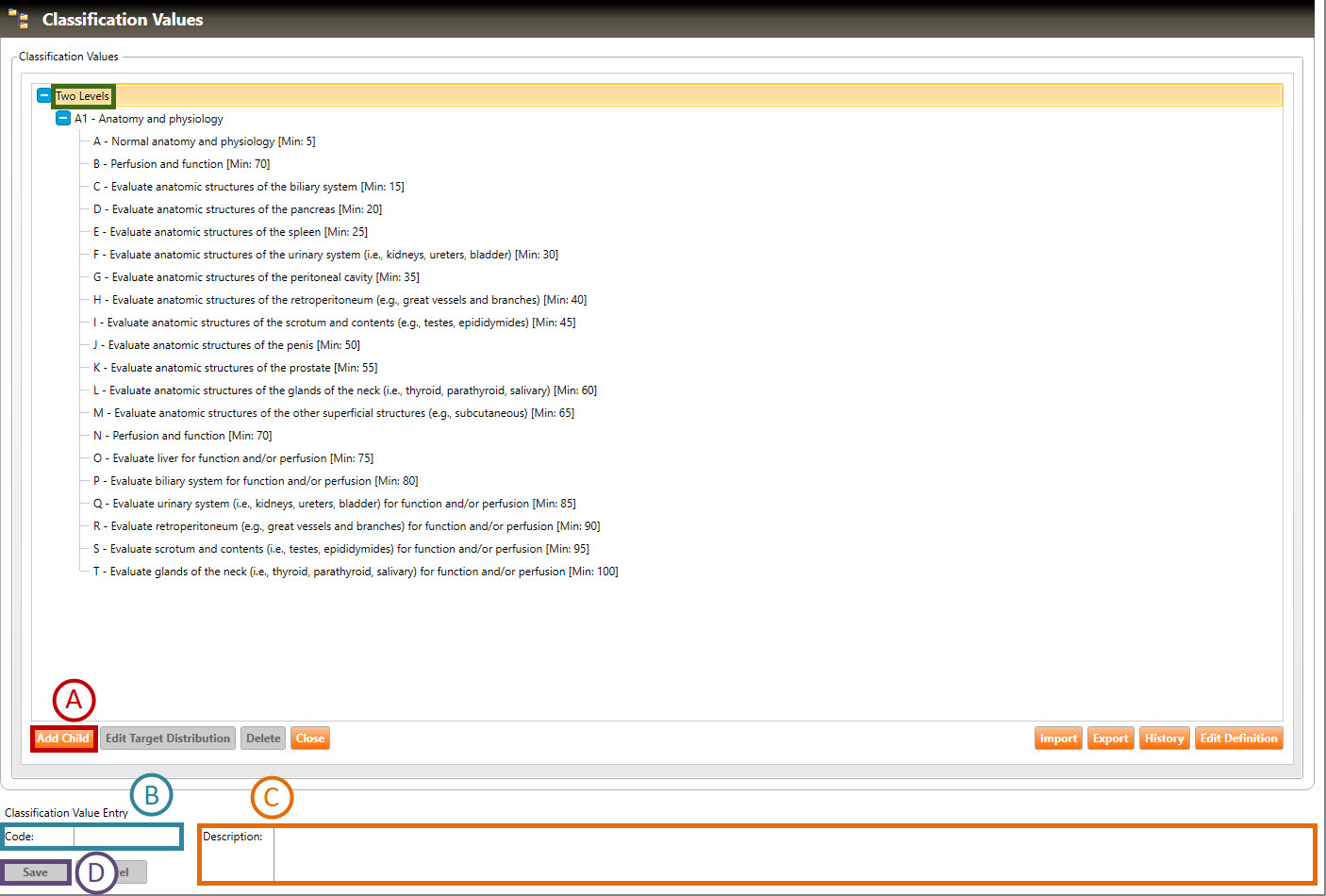 1. Find and view the classification definition you wish to add values to. In the example below, the user is viewing a definition called Two Levels (highlighted in green). Follow Steps A through D, below, to add the first-level classification value entry: