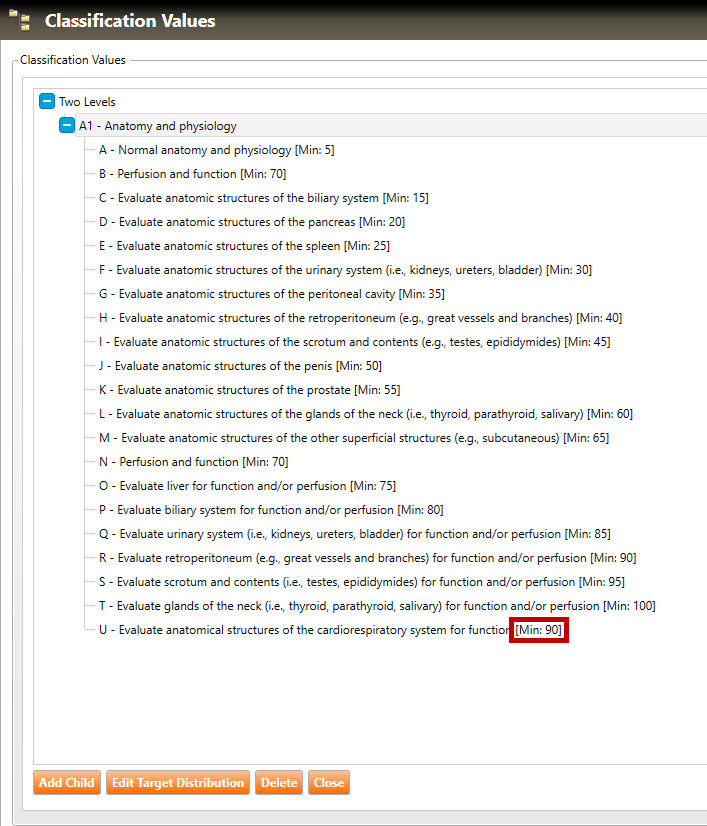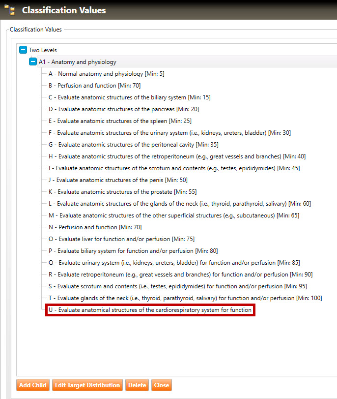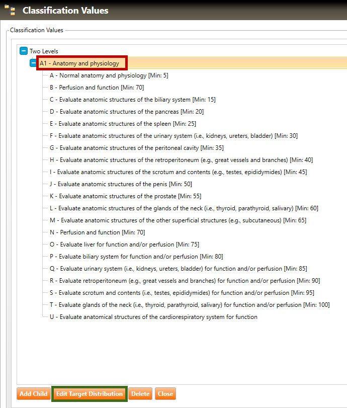 4. To add target distribution values (for an exam) to a level of the hierarchy, click on the desired hierarchy (highlighted in green, below), then click the Edit Target Distribution button (highlighted in red, below):