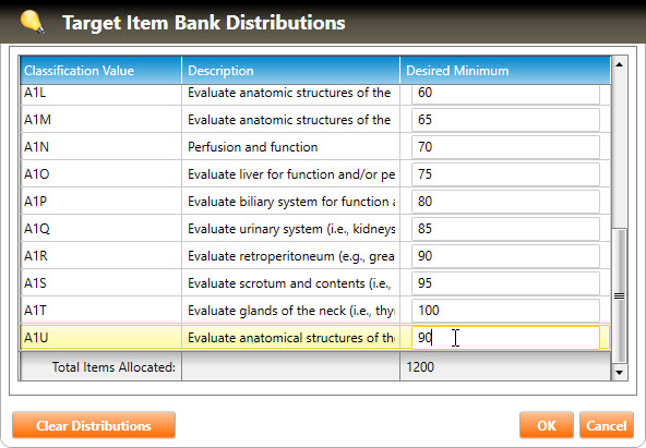 5. When the Target Item Bank Distributions window appears (shown below), enter the Desired Minimum values for each Classification Value of the selected level of hierarchy (to clear all values, click the Clear Distributions button).
