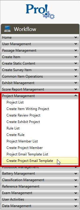 1. In the Workflow menu, click Project Management > Create Project Email Template: