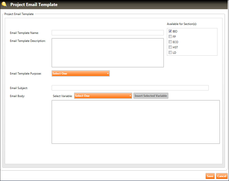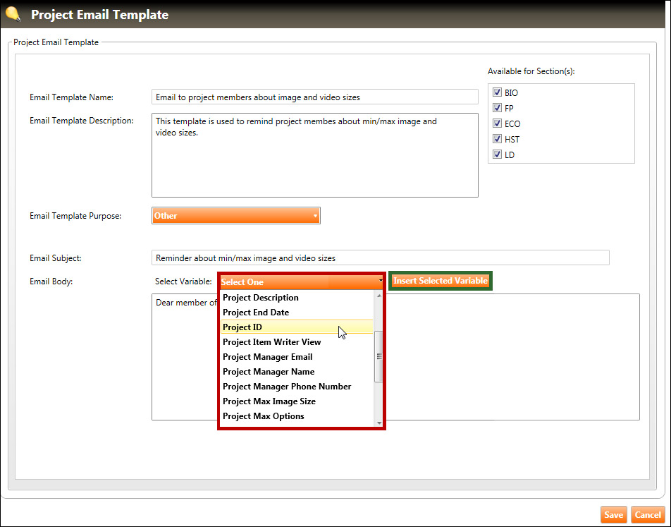 8. Click the Save button to save the new project email template.
