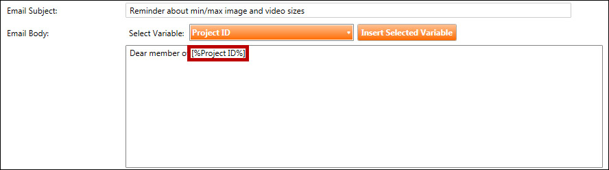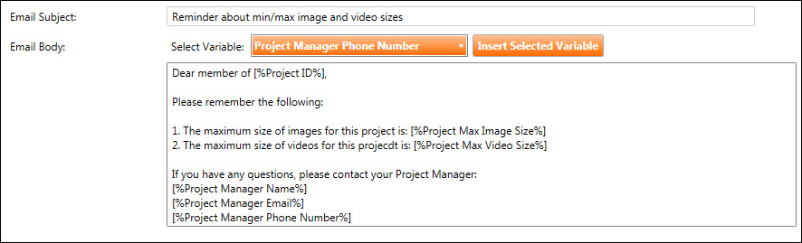C. Continue adding text and variables to complete the project email template. In the example below, an email template has been created that reminds team members about min/max image and video sizes.