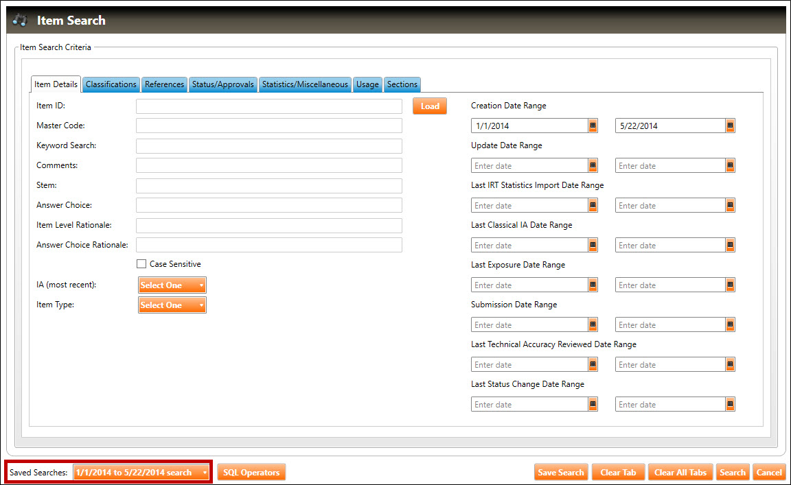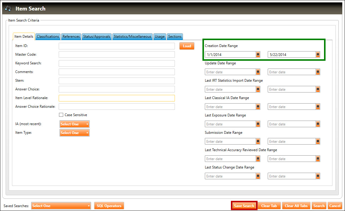 1. Perform an item search. In the example below, the user is about to search for all items that have a Creation Date Range of between 1/1/2014 and 5/22/2014 (highlighted in green, below):