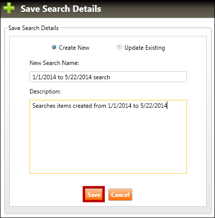 Note: You may also first run the search (by clicking the Search button), and then click the Save Search button (from the Search Results screen) and proceed below.