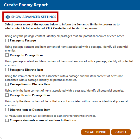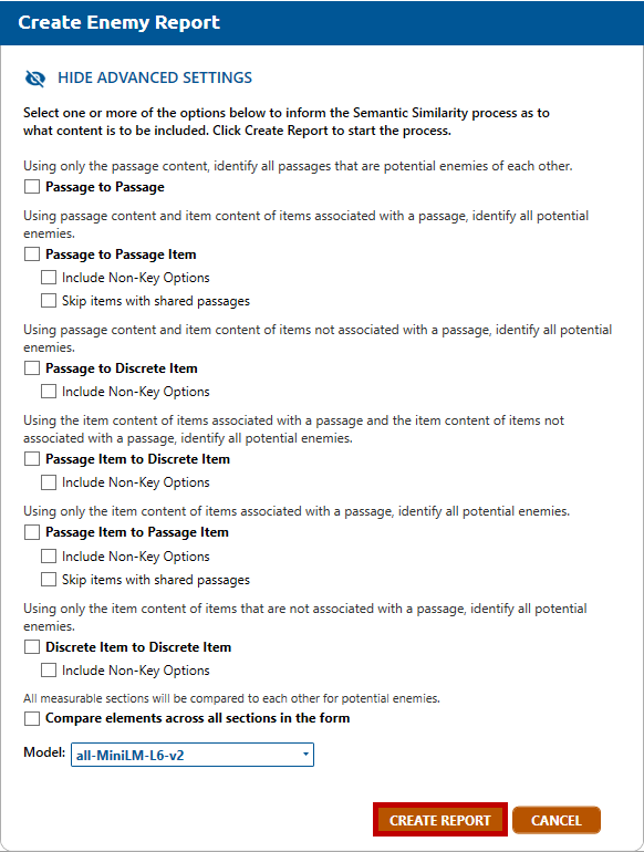 Passage Item to Discrete Item: Compares the item content of passage-associated items to the item content of discrete items to identify potential enemies.