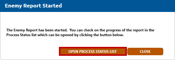 4. The Enemy Report Started dialog will open. The Enemy Analysis report will run in the as a process in Pro. Click the Open Process Status List button (highlighted in red, below) to navigate to the Process Status list screen to track its progress and view the output.
