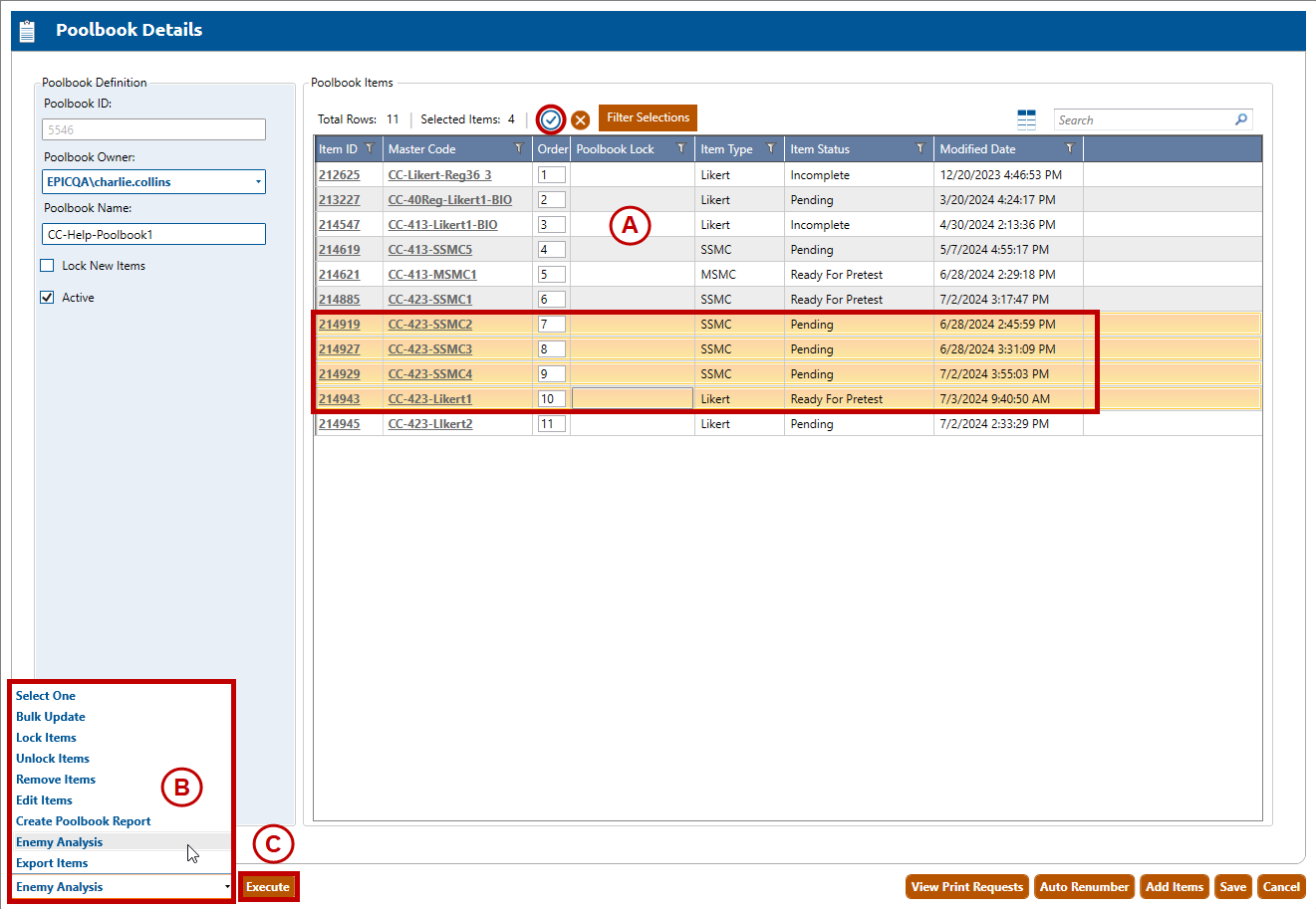 A. Select the poolbook items that you wish to use in the Enemy Analysis report. To select all poolbook items, click the checkmark button (circled, above). In the example above, the user has selected four poolbook items to use in the report. If no items are selected, then all will be selected by default.