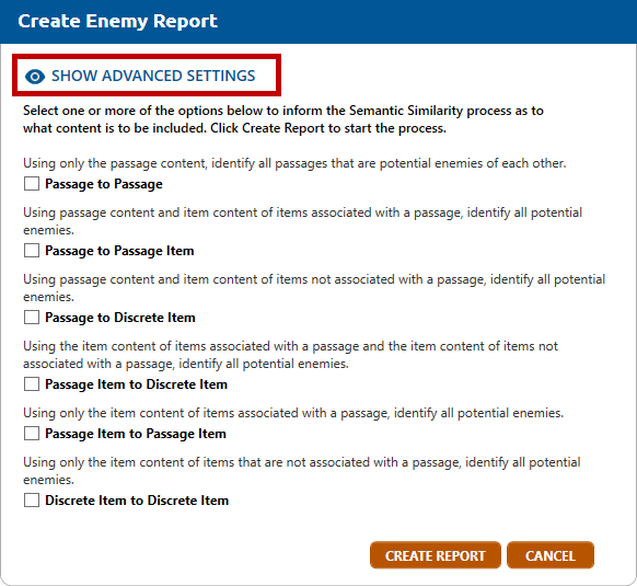 Passage Item to Discrete Item: Compares the item content of passage-associated items to the item content of discrete items to identify potential enemies.