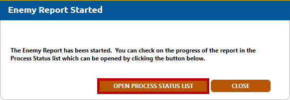 4. The Enemy Report Started dialog will open. The Enemy Analysis report will run in the as a process in Pro. Click the Open Process Status List button (highlighted in red, below) to navigate to the Process Status list screen to track its progress and view the output.