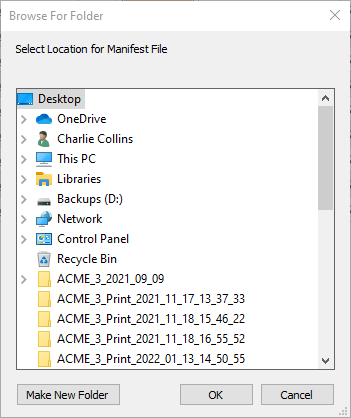 The Browse For Folder dialog will appear. Provide a location on the local machine where the examination manifest file should be saved and click OK.