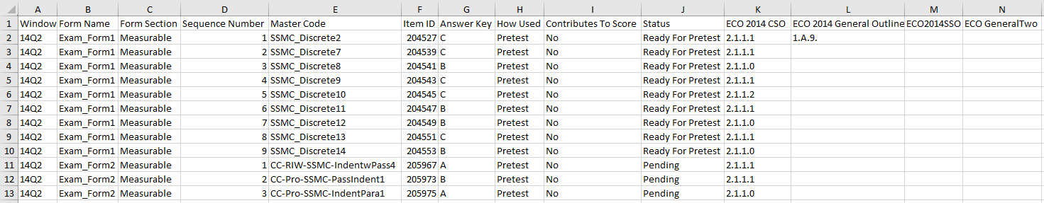 An Examination Manifest is an Excel report generated from one or muliple forms of an exam form group that will allow the test publisher to verify that the examination matches it's specification.