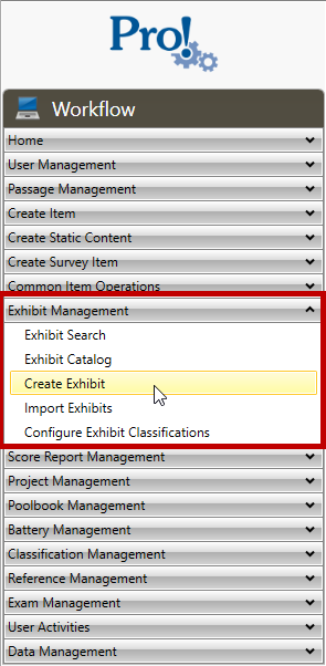 1. In the Workflow menu, click Exhibit Management > Create Exhibit: