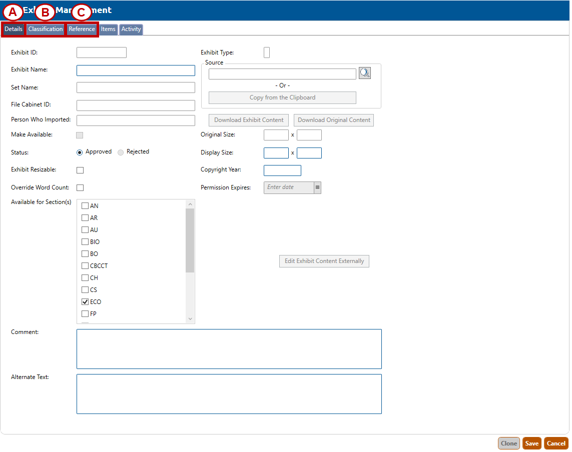 2. The Exhibit Management screen will appear (see figure below), and will default to the Details tab.