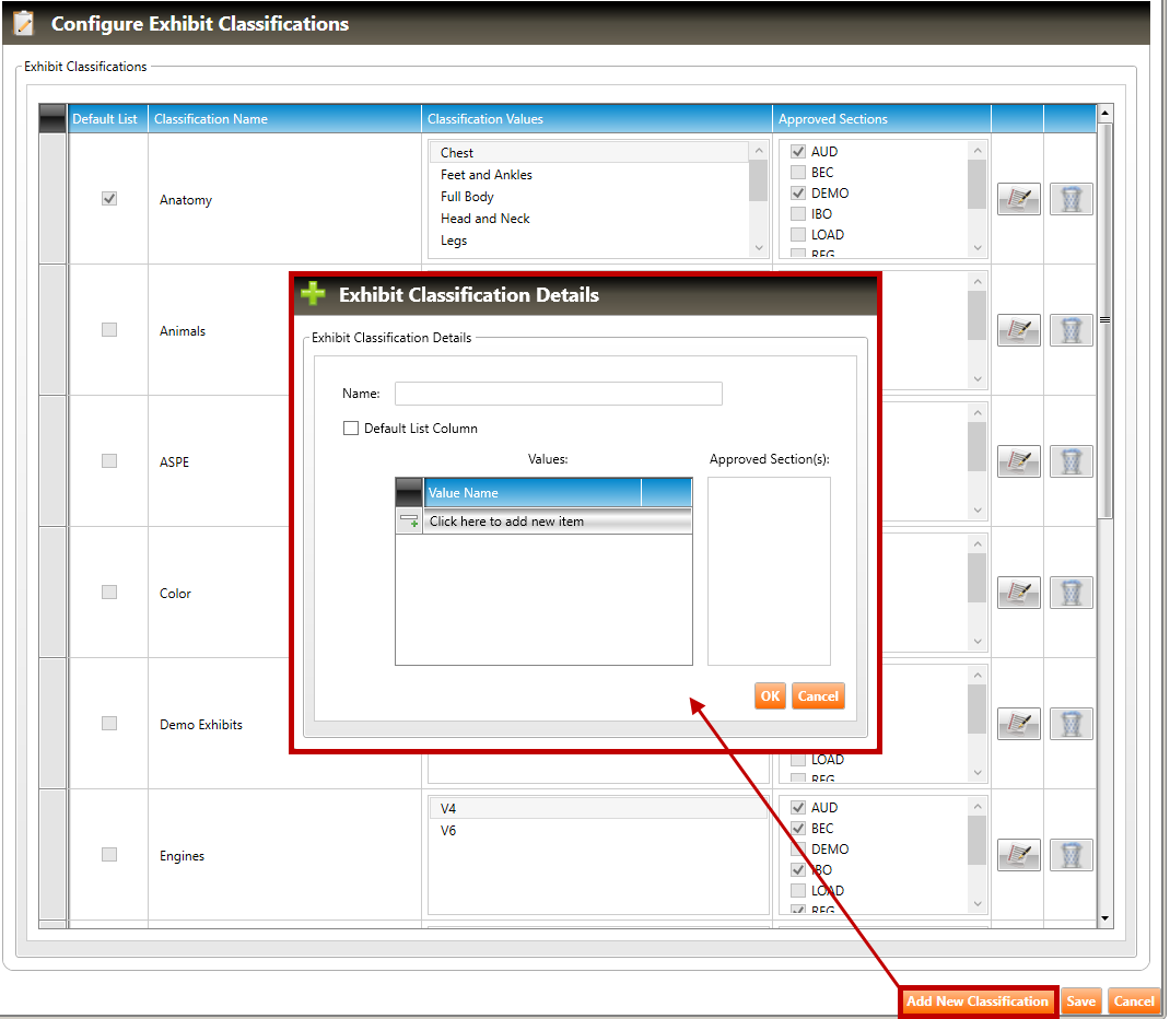 2. When the Configure Exhibit Classifications screen appears (see figure below), click the Add New Classification button to open the Exhibit Classification Details pop-up window.