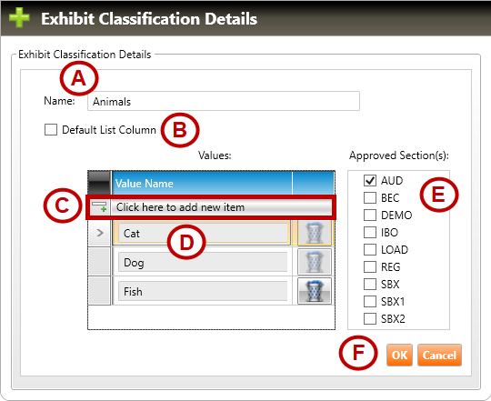 3. Follow Steps A through F, below, to create the new exhibit classification: