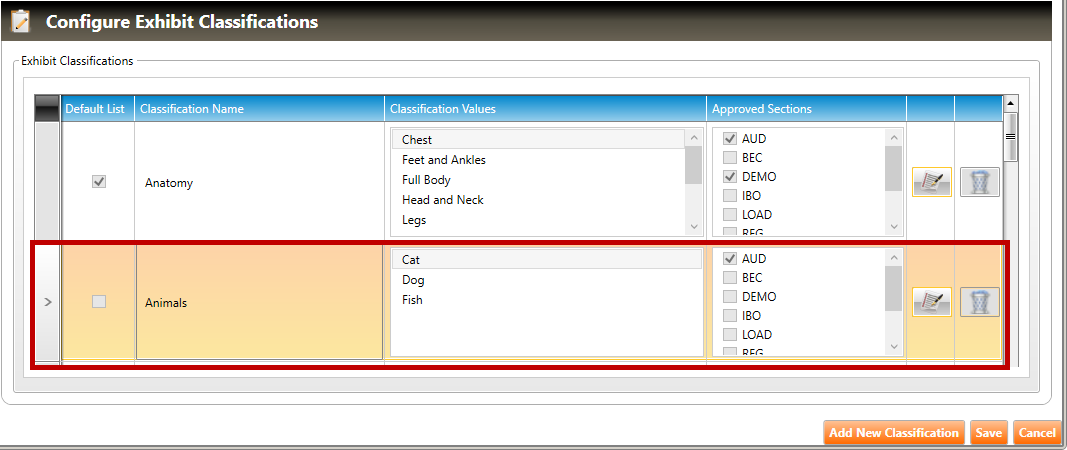 4. The new classification will appear in the Configure Exhibit Classifications screen: