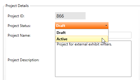 2. The Exhibit Writing Project Management screen will appear (see figure below), and will default to the Details tab.