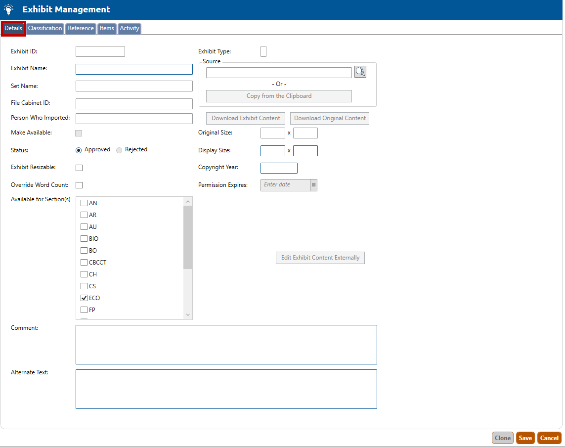 7. Select one or more sections from Available for Section(s) for which the exhibit may be used in an item. You are required to approve at least one section for an exhibit.