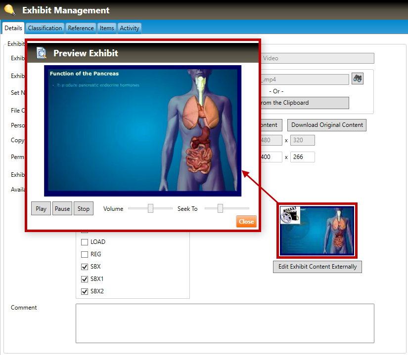 C. To preview the video clip at its Display Size (i.e., the size at which the video will display when used in an item), click the small preview image to open a full-sized Preview Exhibit window (shown below). You may Play, Pause, and Stop the video, change the Volume, or skip ahead by sliding the Seek To slider. Click the Close button to close the preview window.
