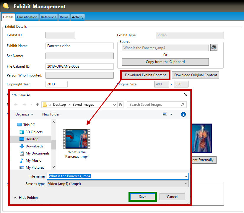 D. At any time, you may wish to download the exhibit's video from Pro! to your local or network drive. To do this, click the Download Exhibit Content button (highlighted in red, below). This will open a Save As dialog box. Browse to the desired local or network drive, then click the Save button (highlighted in green, below) to save the file.
