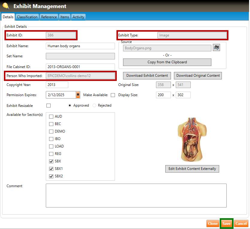 The image will be downloaded to the Pro! system, and a small preview of it will appear in the Exhibit Management window (highlighted in green, below). The name of the source file will appear in the Source field. In the example below, the user has downloaded a picture of human organs.
