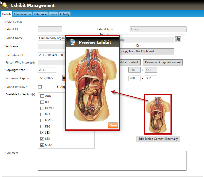 C. To preview the image at its Display Size (i.e., the size at which the image will display when used in an item), click the small preview image to open a full-sized Preview Exhibit window (shown below). Click the Close button to close the full-sized preview window.