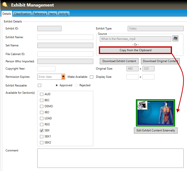 i. To copy an audio/video clip that already has been copied to your computer's clipboard (memory), click the Copy from the Clipboard button (highlighted in red, below). The audio/video clip in memory will be copied to the Pro! system, and a small preview of it will appear in the Exhibit Management window (highlighted in green, below). In the example below, the user has copied a video of the human pancreas.