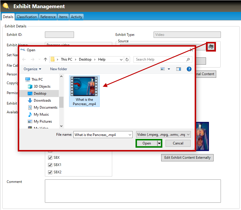The audio/video clip will be downloaded to the Pro! system, and a small preview of it will appear in the Exhibit Management window (highlighted in green, below). In the example below, the user has downloaded a video clip of the human pancreas.