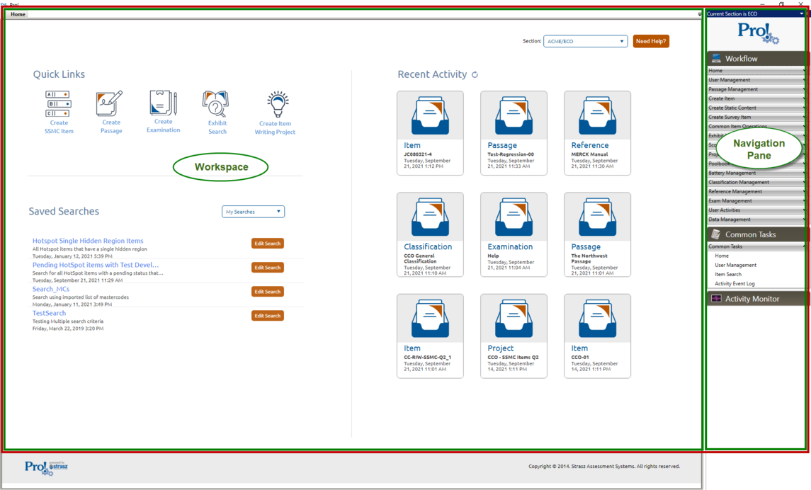 In the default layout of the Pro! environment (shown below), everything appears within one window (highlighted in red). The tabs appear across the top of the window in the Workspace, and the Navigation Pane appears along the right side of the window (highlighted in green).
