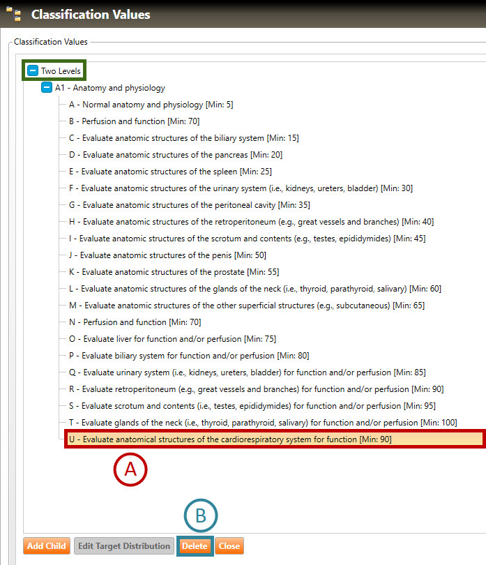 1. Find and view the classification value you wish to delete. In the example below, the user is viewing a definition called Two Levels (highlighted in green). Follow Steps A through B, below, to delete the value entry: