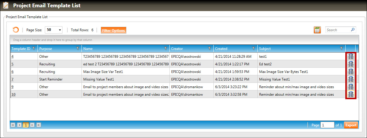 3. Click the trash can icon (highlighted in red, above) of the project email template you wish to delete.