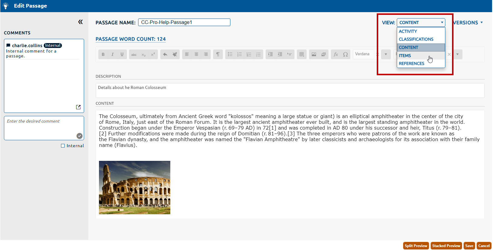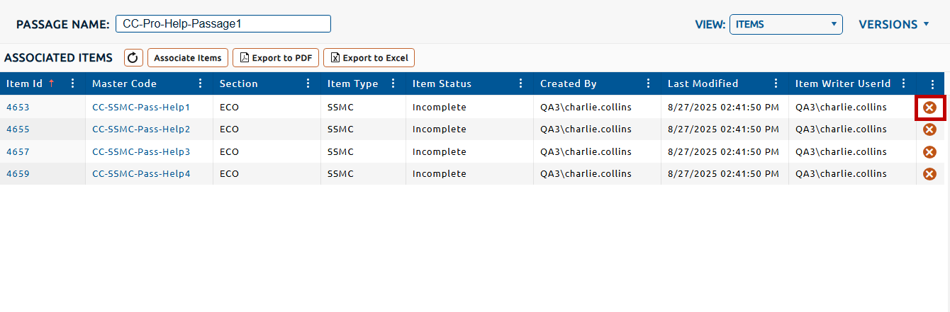 2. The items currently associated with the passage are displayed in the Associated Items table. Click the X icon (highlighted in red, below) next to the item that will have its association removed.
