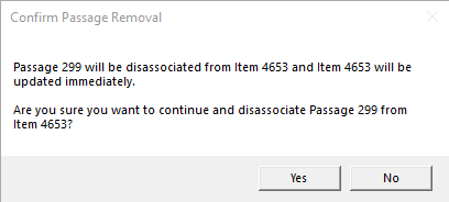 3. The Confirm Passage Removal dialog is opened. Click Yes to persist the disassociation.