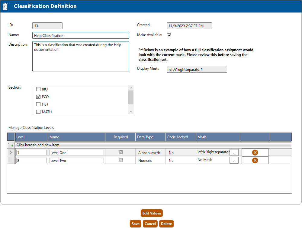 7. Click the Save button to save your changes and stay on this screen, or click the Edit Values button to save your changes and return to the previous screen.