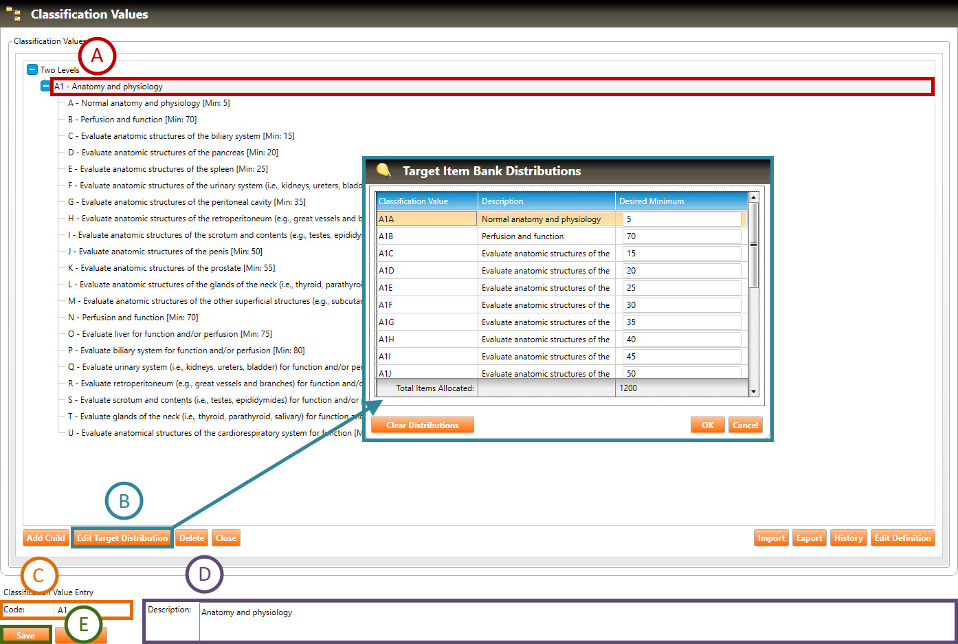1. Find and view the classification value you wish to edit. In the example below, the user is viewing a definition called Two Levels (highlighted in green). Follow Steps A through E, below, to edit the value entry: