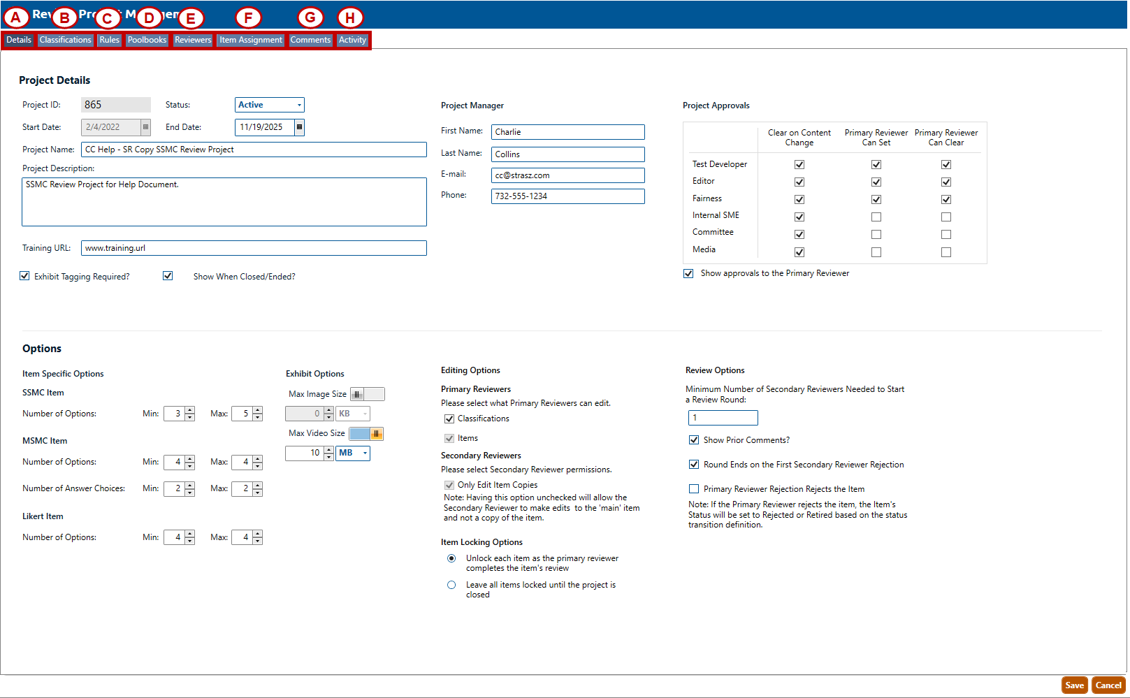 screen will appear (shown below). Navigate through each of the five tabs (labeled in the figure below) to edit information related to the project.