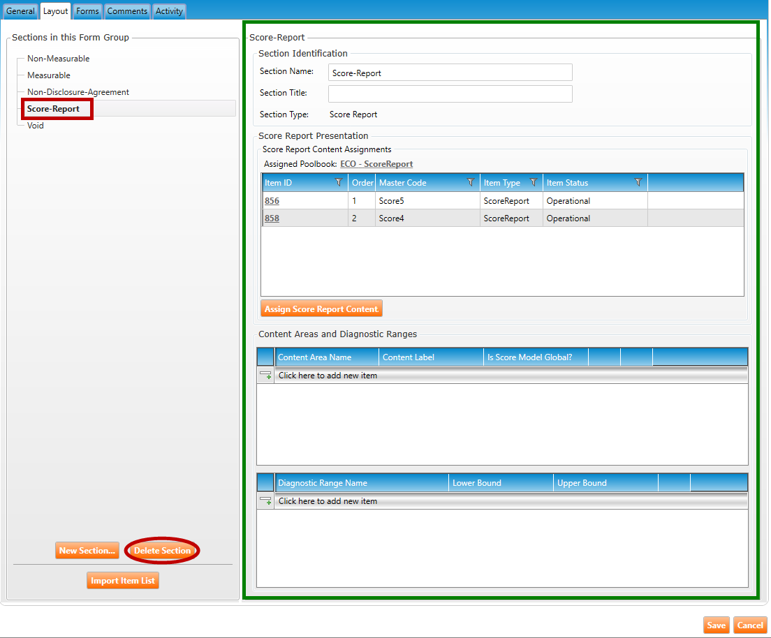 To edit a score report section, click the name of it on the left side of the screen (in the example below, the section named Score-Report has been selected). The details will appear on the right side of the screen (highlighted in green, below).