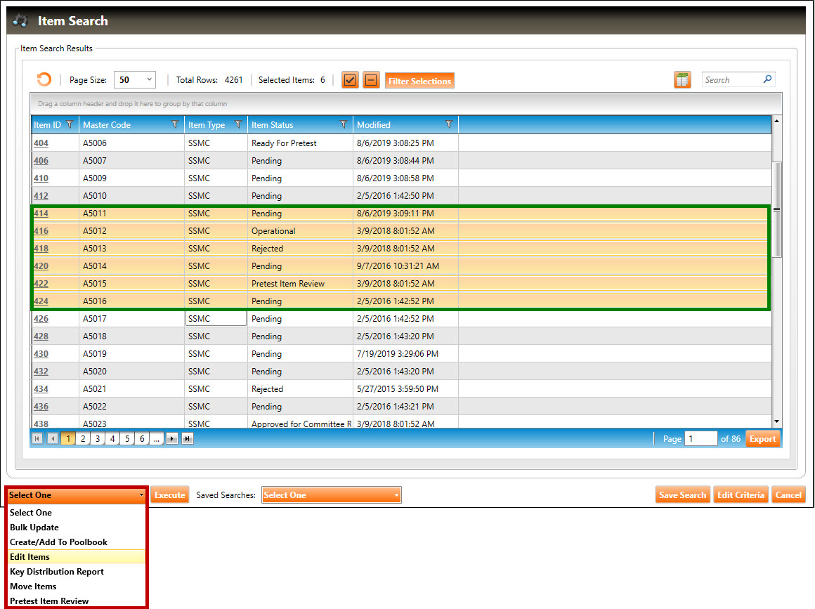 2. Select the items you wish to edit. In the example above, the user has selected six items (highlighted in green).