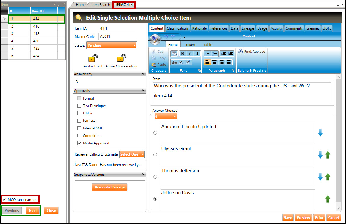 3. Select Edit Items from the Select One dropdown list (highlighted in red, above), then click the Execute button. The item editing environment will appear (shown below), with a menu of items in the left column, and an item tab on the right. In the example below, the user has selected Item ID 414 (highlighted in green rectangle), which opened SSMC 414 in a tab (highlighted in red rectangle). From here, you can edit the item.
