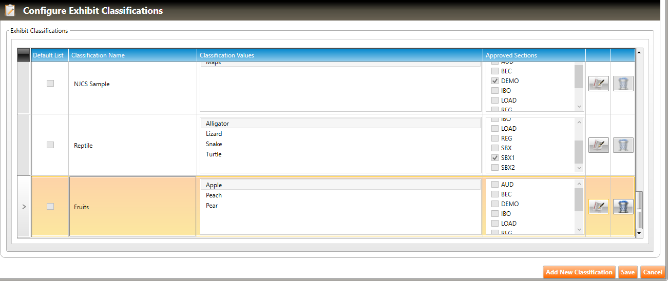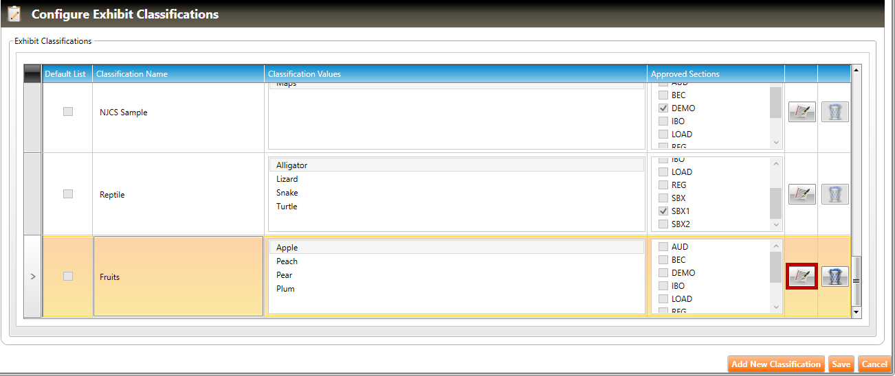 2. When the Configure Exhibit Classifications screen appears (see figure below), click the edit button (highlighted in red below) for the classification you wish to edit.