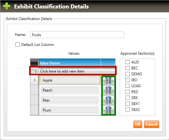 7. To delete an item from the classification, click the trash can icon (highlighted in green, above) for the desired item from the Value Name table.