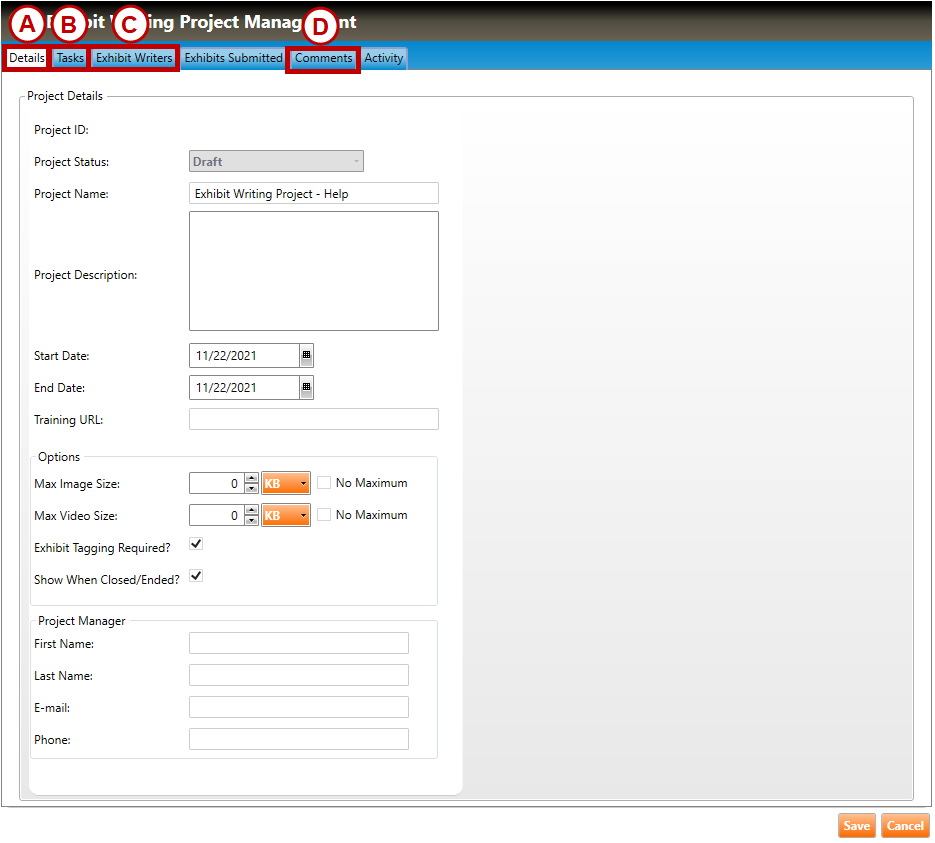 screen will appear (shown below). Navigate through each of the five tabs (labeled in the figure below) to edit information related to the project.